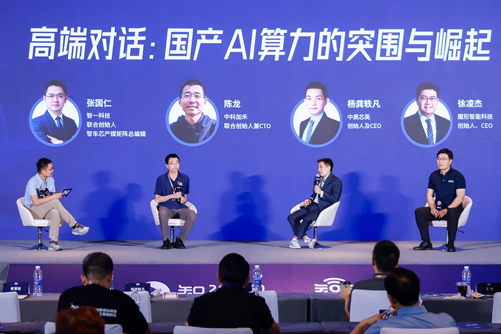 以《国产AI算力的突围与崛起》为主题的高端对话,由智一科技联合创始人、智车芯产媒矩阵总编辑张国仁主持,中昊芯英创始人兼CEO杨龚轶凡,魔形智能科技创始人、CEO徐凌杰,中科加禾联合创始人兼CTO陈龙三位嘉宾进行分享。