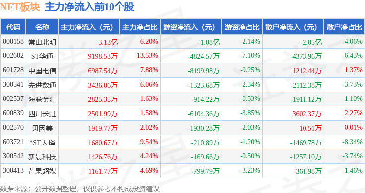 从资金流向上来看,当日NFT板块主力资金净流入2.29亿元,游资资金净流出3.93亿元,散户资金净流入1.64亿元。NFT板块个股资金流向见下表: