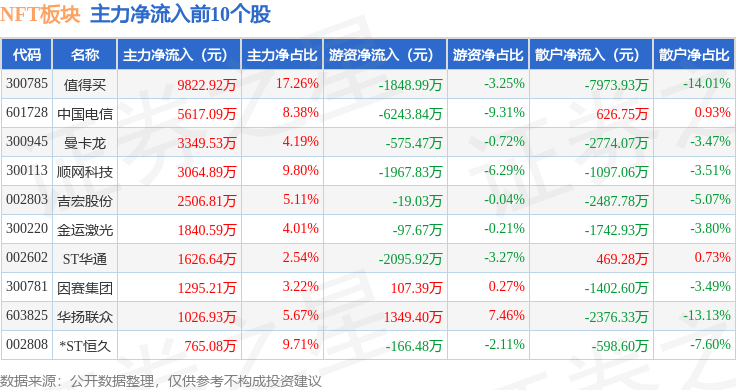 从资金流向上来看,当日NFT板块主力资金净流出14.2亿元,游资资金净流出5273.71万元,散户资金净流入14.73亿元。NFT板块个股资金流向见下表: