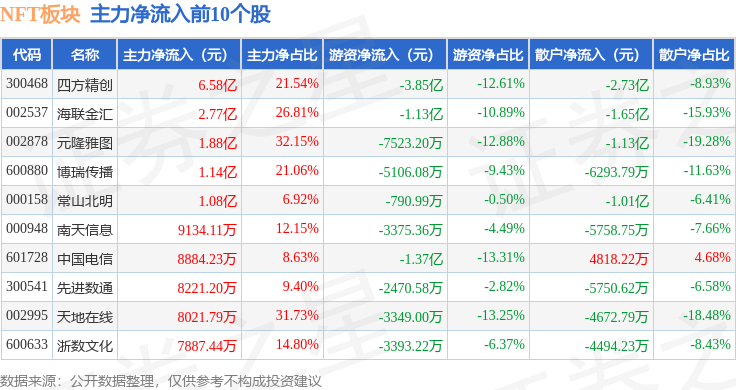 从资金流向上来看,当日NFT板块主力资金净流入17.22亿元,游资资金净流出12.43亿元,散户资金净流出4.78亿元。NFT板块个股资金流向见下表: