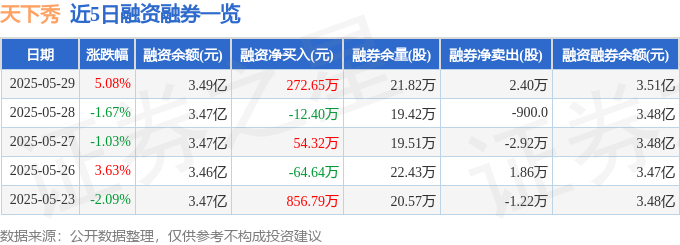证券之星消息,截至2025年5月29日收盘,天下秀(600556)报收于4.96元,上涨5.08%,换手率4.54%,成交量82.05万手,成交额4.03亿元。