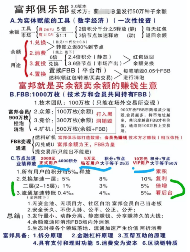 该项目打着数字经济的旗号,采用拆分理财、互助理财、消费致富等理念,声称消费可以获得5倍积分,积分可以置换FBB虚拟币,FBB通过境外虚拟货币交易所兑换USDT虚拟币。
