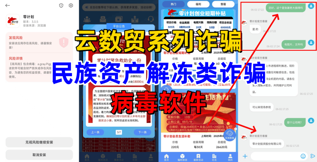 经查,该项目打着被定性传销的“云数贸”的名义,制作散布涉诈APP,虚构推广“零计划创业短期补贴”“零计划会员生活补助”“零计划原始股权”“零计划儿童成长基金”等高额返利理财项目。