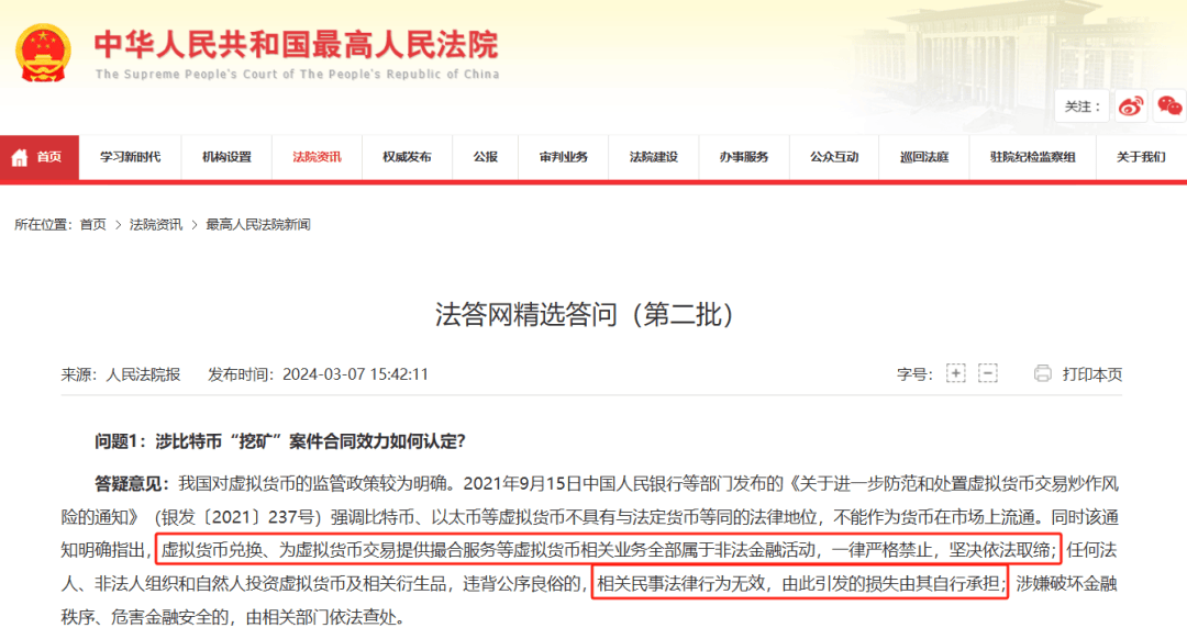 去年3月7日,最高人民法院发文《法答网精选答问(第二批)》,文中提到,虚拟货币兑换、为虚拟货币交易提供撮合服务等虚拟货币相关业务全部属于非法金融活动,一律严格禁止,坚决依法取缔;参与虚拟货币交易,自行承担损失。