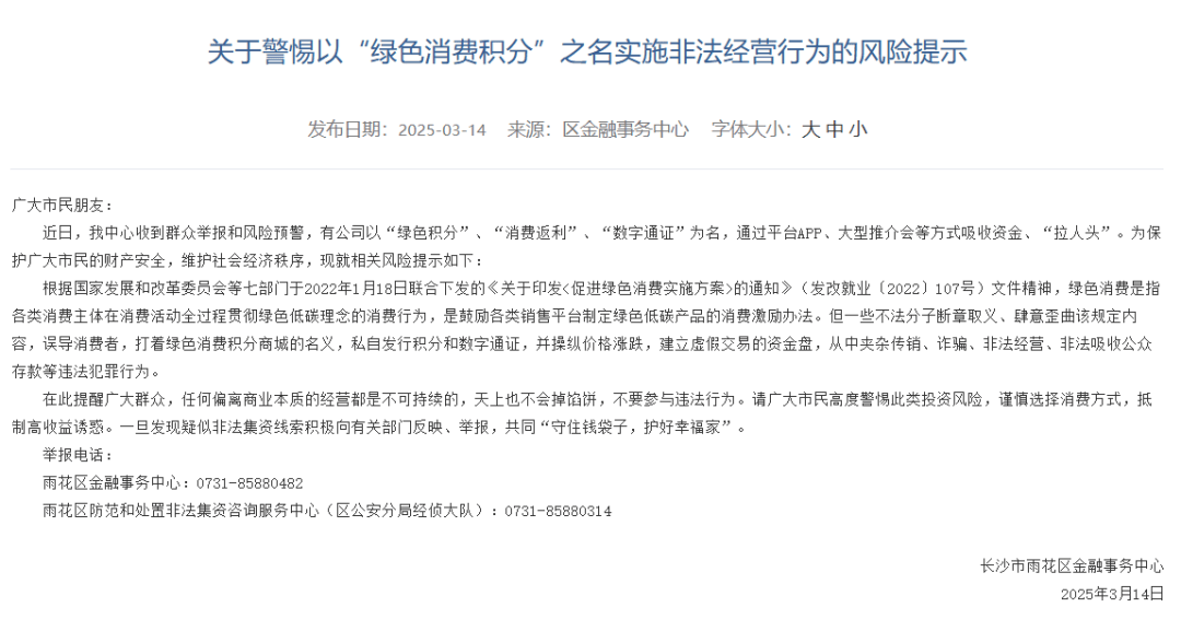 今年3月,长沙市雨花区人民政府网发布《关于警惕以“绿色消费积分”之名实施非法经营行为的风险提示》,文中提到,一些不法分子打着绿色消费积分商城的名义,私自发行积分和数字通证,并操纵价格涨跌,建立虚假交易的资金盘,从中夹杂传销、诈骗、非法经营、非法吸收公众存款等违法犯罪行为。