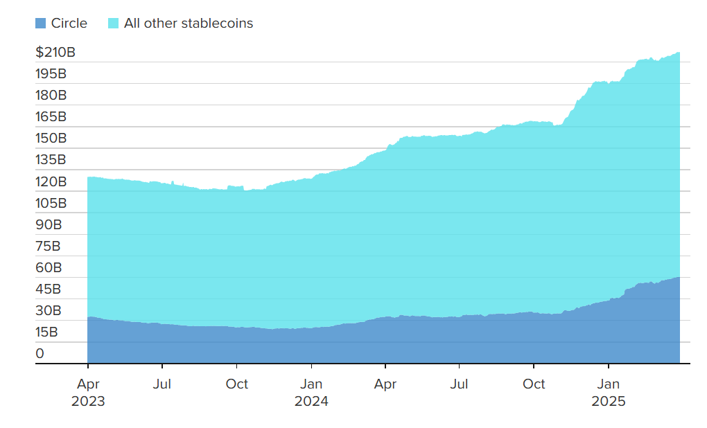 Circle 另外一个身份是美元稳定币USD Coin (USDC)的发行人。据了解,USDC 是全球市值第二大稳定币,该稳定币与美元资产一对一挂钩,包括美元现金和短期国债,流通量约为600亿美元,约占稳定币总市值的26%。