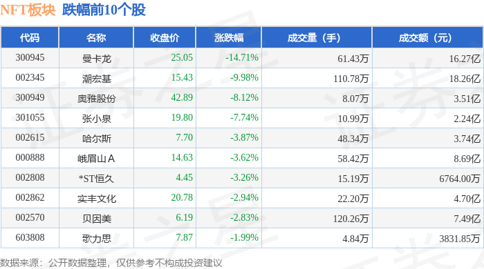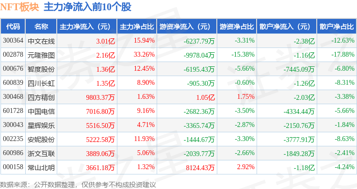 从资金流向上来看,当日NFT板块主力资金净流出5759.72万元,游资资金净流入2.25亿元,散户资金净流出1.67亿元。NFT板块个股资金流向见下表: