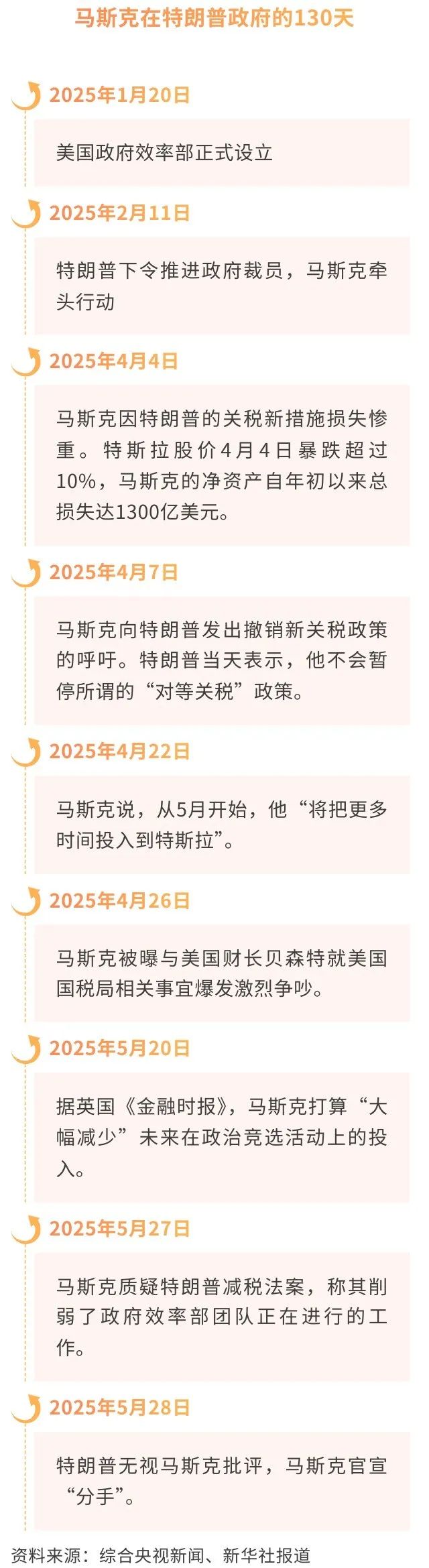 据央视新闻,当地时间5月30日,美国总统特朗普和美国企业家、政府效率部负责人埃隆·马斯克在白宫举行新闻发布会。马斯克28日在社交媒体上说,他即将离开特朗普政府,不再继续担任“特别政府雇员”一职。这也意味着,马斯克在1月20日就任美国政府效率部负责人仅130天后,便与特朗普政府官宣“分手”。