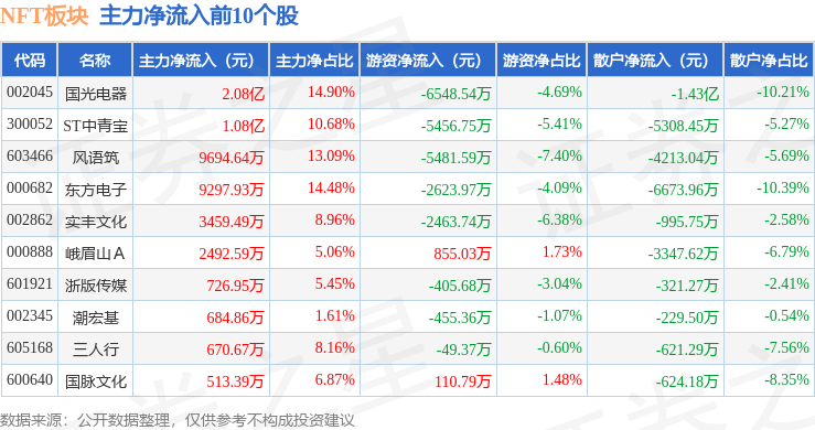 从资金流向上来看,当日NFT板块主力资金净流出26.31亿元,游资资金净流入1.02亿元,散户资金净流入25.29亿元。NFT板块个股资金流向见下表: