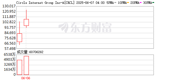 Circle于6月5日正式上市,短短两日内股价暴涨至107.7美元,较发行价31美元累计涨幅高达247%,盘中最高涨至123.5美元附近。美国资产管理公司Alger合伙人和执行副总裁张韵表示,市场对稳定币的热情非常高,但考虑到认购份额较低和股价短期已经较高,不少机构在上市首日获利了结。