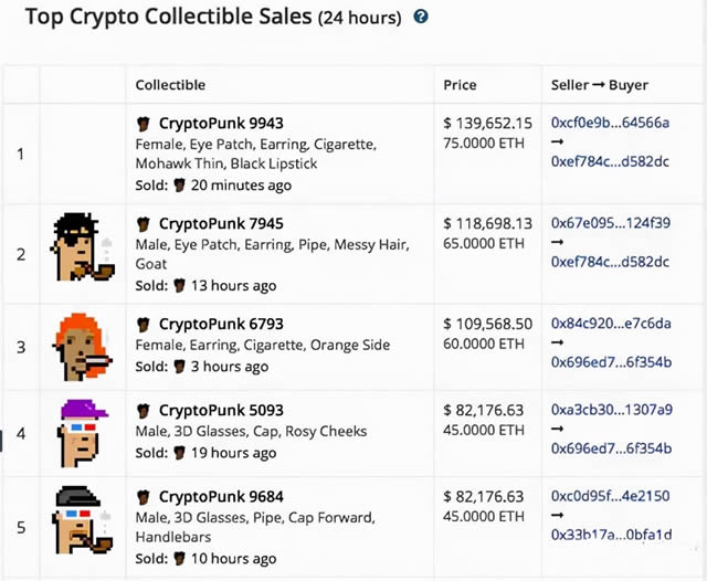 CryptoPunks共有1万个收藏品,基于以太坊发行的ERC-721的NFT。在CryptoPunks的世界中,没有任何两个收藏品是相同的。所有的CryptoPunks都是24×24像素的艺术图片,由算法生成的,大多数的类型是男人或者是女人,不过有一些更加稀有的Punks,比如:僵尸和外星人。在过去的12个月,CryptoPunks卖出6762个收藏品,平均价格是11.3ETH,总销售额超过了1.27亿美元。或许大家很难想象,看上去平淡无奇的小头像,竟然卖到了1.27亿美元。