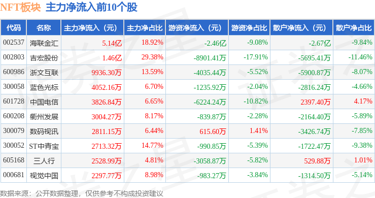 从资金流向上来看,当日NFT板块主力资金净流入3.09亿元,游资资金净流出3.09亿元,散户资金净流入73.8万元。NFT板块个股资金流向见下表: