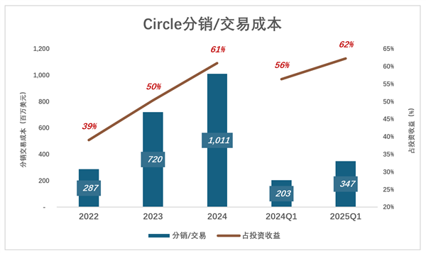 2024年,分销/交易成本突破10亿美元(其中Coinbase拿走9.08亿美元)、占投资收益的60.9%;同期,Circle净利润竟然降至1.57亿美元,给Coinbase打工的报酬越来越低!