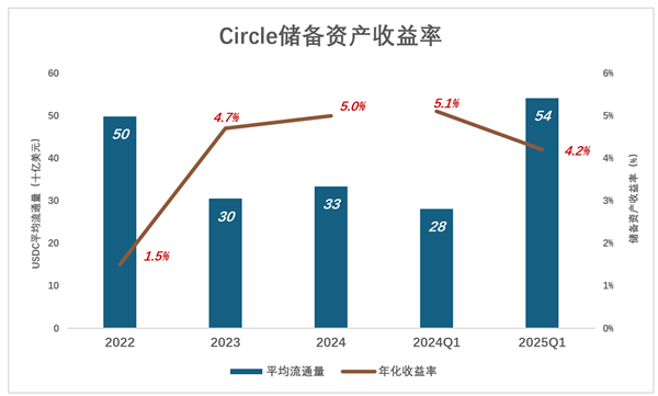 2025年Q1,USDC平均流通量541.4亿美元,收益5.6亿美元,年化收益率4.2%;