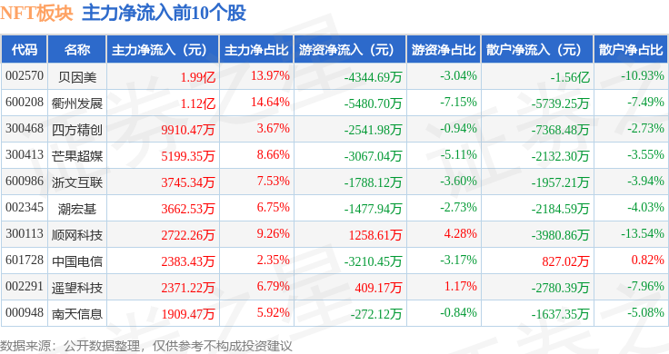 从资金流向上来看,当日NFT板块主力资金净流入1632.11万元,游资资金净流出1.7亿元,散户资金净流入1.54亿元。NFT板块个股资金流向见下表: