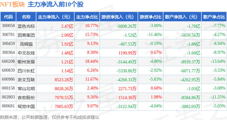 从资金流向上来看,当日NFT板块主力资金净流入3465.74万元,游资资金净流出3862.98万元,散户资金净流入397.24万元。NFT板块个股资金流向见下表: