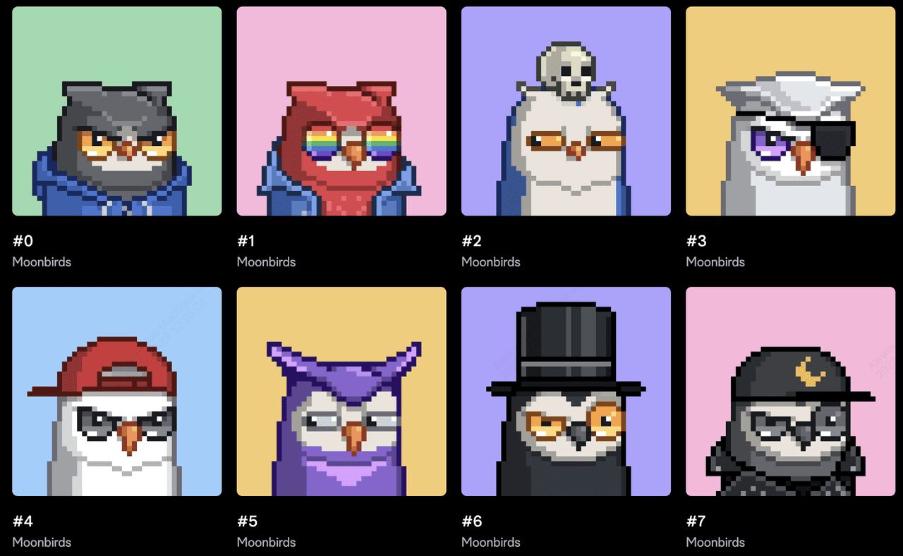 Moonbirds于2022年4月由PROOF Collective推出,迅速成为以太坊最知名的NFT系列之一,拥有10,000个像素化的猫头鹰头像。这些NFT不仅仅是个人档案图片它们还是进入一个独家社区的钥匙,该社区由艺术家、收藏家和构建者组成,共同塑造Web3艺术与文化的未来。每只Moonbird都拥有独特的特征和完全链上像素艺术(直接从智能合约渲染),为持有者提供个人和商业使用权。该项目引入了创新的机制,如所有权证明,允许自定义头像并可享受空投、策展艺术展览如钻石展览以及名为Talons的奖勋点数,这些点数可以兑换实物商品、数字收藏品和现场活动体验。