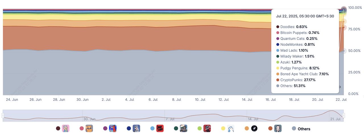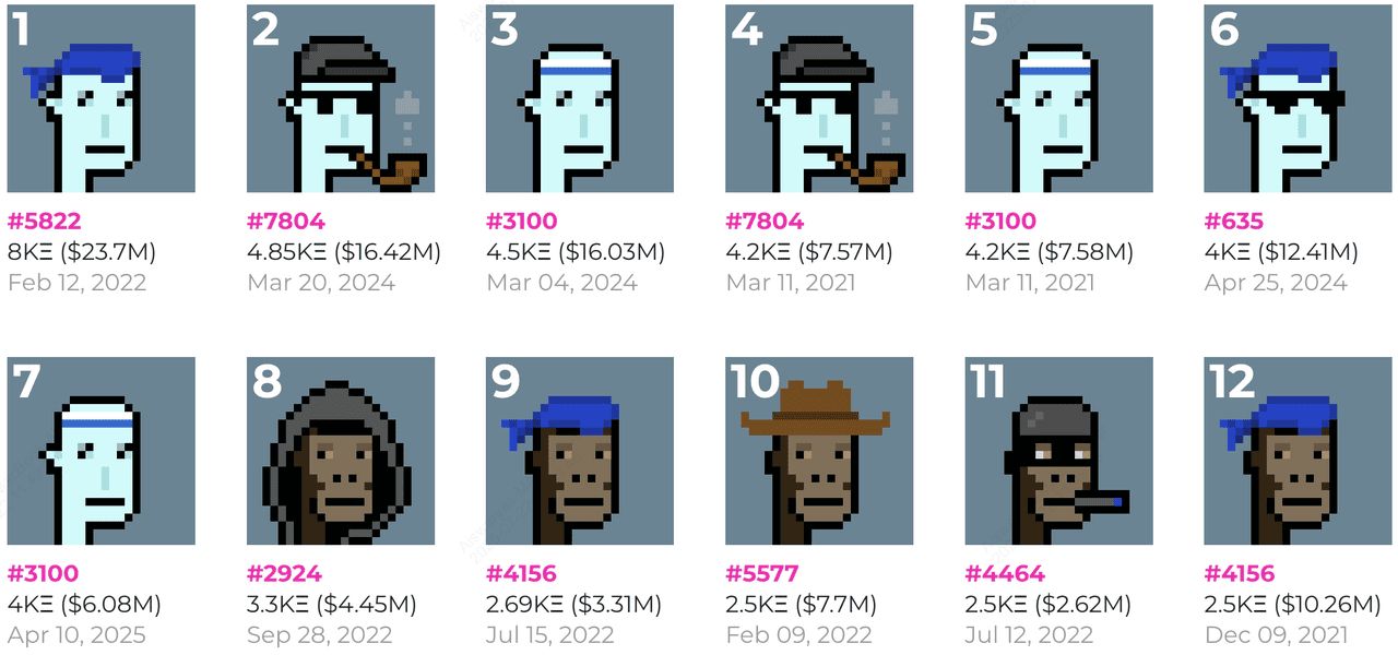2025年7月,CryptoPunks再次证明了其持久的影响力,一名买家扫货了45个Punk,价值超过2,080 ETH(780万美元)。这笔巨额交易触发了每周交易量的500%激增,并将底价推高了17%,达到47.75 ETH(约183,000美元)。 CryptoPunks经常被视为NFT世界中的“蓝筹”资产,许多投资者将其视为在波动市场周期中的避风港,这使其成为本次Altcoin季节NFT热潮中最受关注的系列之一。