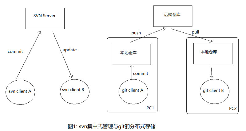 而git不一样,它是没有中心服务器的,每个人机器上都是一个完整的库,里面就有各个版本的变更信息,我们开发完代码以后先commit到本地仓库,在push推送到远程服务器,假如远端服务器坏掉了,只需要把本地仓库重新push一次即可,版本变更记录还在。