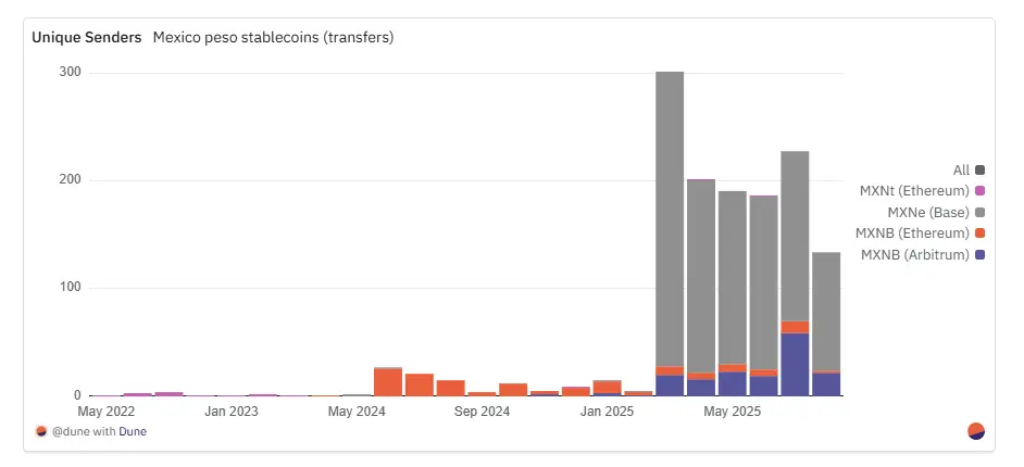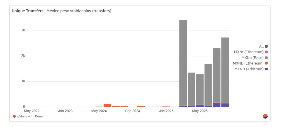 墨西哥比索锚定稳定币(MXNB+MXNe)在2025年7月总市值达到约3400万美元,较2024年7月的100万比索(约合5.3万美元)实现约638倍年增长。