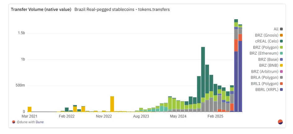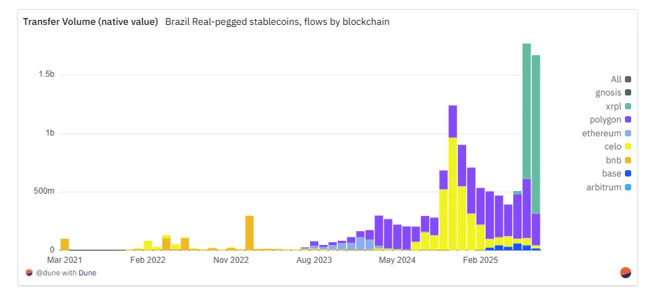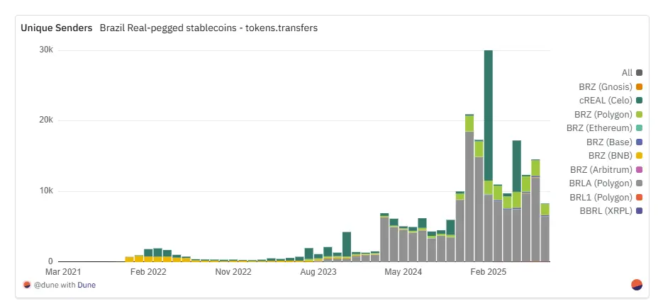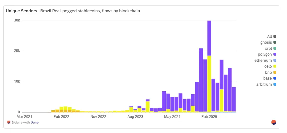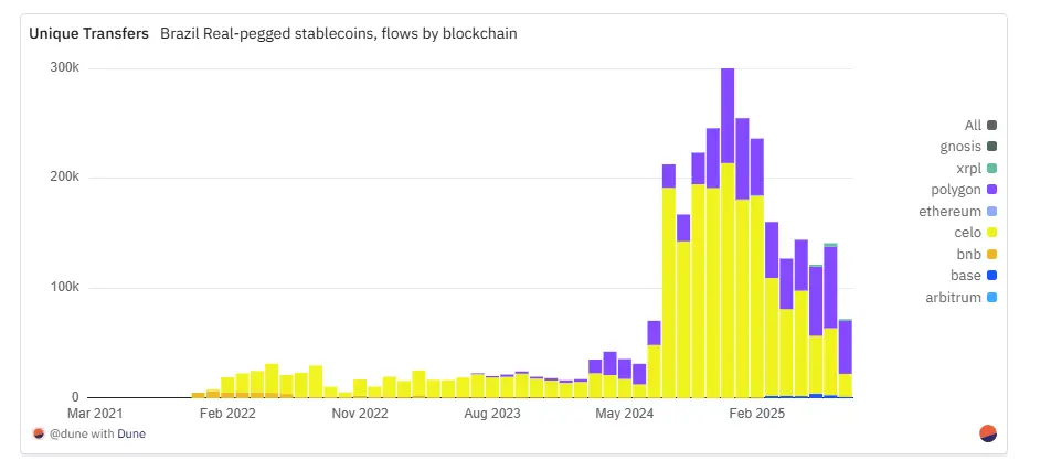 与发行和转账交易集中在以太坊主网的美元稳定币不同,雷亚尔稳定币的交易活动主要集中在Layer2网络和其他公链上。Polygon凭借原生交易量和活跃用户量成为主导通道:在2025年7月,录得约7.4万笔交易(涉及1.4万名独立用户),月交易量更是创下5亿雷亚尔(约合5000万美元)的历史记录。