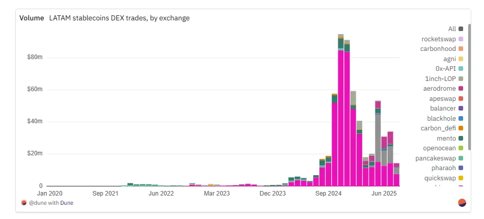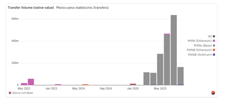 对比十分明显:MXNB现在主导小额零售支付场景,而MXNe则专注于大额结算。相较巴西雷亚尔更分散的生态格局,墨西哥市场仍集中于这两家发行方及少数结算通道,但这并未阻碍流动性增长。自2025年年中起,墨西哥比索货币对的DEX交易量已迅速攀升至榜首,标志着市场结构日趋成熟。