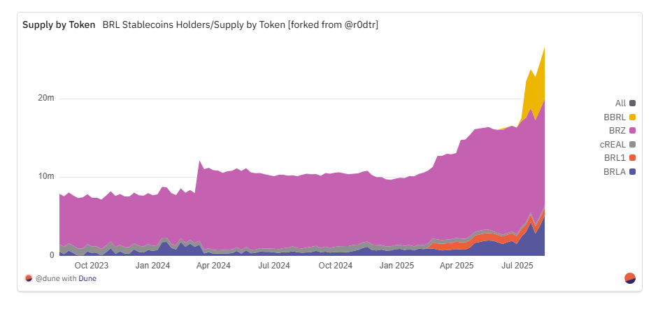 截至2025年6月,五种不同的锚定巴西雷亚尔的稳定币正在活跃流通,这降低了市场集中度,也成为生态系统成熟的标志。其中:金融科技公司Transfero发行的BRZ,为拉美地区的银行、支付机构提供区块链基础设施解决方案;Celo公链发行的cREAL主打移动优先的DeFi集成方案;BRLA Digital、Avenia开发的BRLA聚焦合规的法币可作为加密货币桥梁服务;由Mercado Bitcoin、Bitso、Foxbit等交易所联盟支持的BRL1致力建立行业通用标准;Braza集团的BBRL则定位服务于区域贸易和支付场景。