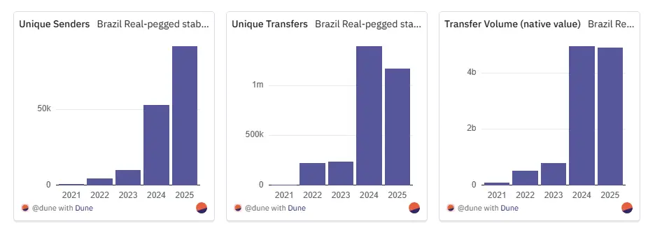 巴西为该趋势提供了最清晰的案例研究,与巴西雷亚尔挂钩的稳定币呈现了惊人的同比增长。交易活动量从2021年仅5000余笔,暴增至2024年的140万笔以上,2025年内迄今仍维持在120万笔高位,较四年前激增逾230倍。独立发送方数量同样呈指数级增长:从2021年不足800个飙升至2025年超9万个,仅2023年以来就增长达11倍。链上原生转账量从2021年约1.1亿雷亚尔(约合2090万美元,按发稿时汇率)跃升至2025年7月的近50亿雷亚尔(约合9亿美元),几乎追平2024全年总量。若计入8月迄今数据,2025年转账总量已超越2024全年。这场始于边缘化实验的创新,在短短数年间已迅速成长为巴西链上经济的核心支柱,无论是交易规模、用户基数还是转移价值均实现了数倍级的爆发式增长。
