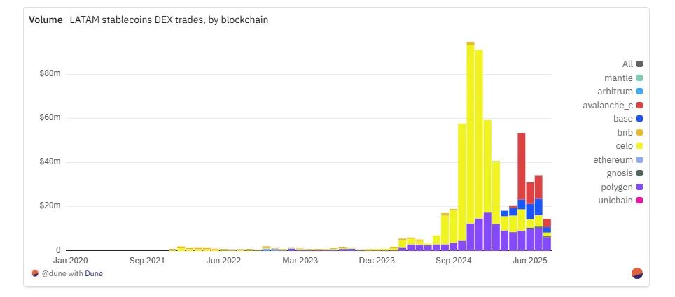 稳定币流动性模式仍与其原生链及主流DEX深度绑定。Celo以3.63亿美元总交易量居首,其中Mento平台上的cREALcUSD、USDC交易占据绝对主导,该交易对在2024年7月至2025年2月期间持续领跑美元计价交易量。Polygon以1.36亿美元位列第二,通过Uniswap和QuickSwap提供多样化的巴西雷亚尔稳定币流动性(尤以BRLA和BRZ为主),凸显其在稳定币转移与DeFi、支付生态的双重功能。Avalanche以约5480万美元排名第三,主要受Trader Joe 2025年5月MXNBWAVAX交易激增推动,Uniswap、Pharaoh及1inch限价订单协议进一步为巴西雷亚尔和墨西哥比索市场补充流动性。Base以约2620万美元紧随其后,其流动性几乎全部来自Aerodrome平台的MXNeUSDC交易,该交易量与Base在2025年发力本地稳定币的战略呈现同步增长。