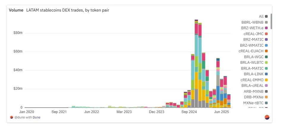 拉丁美洲地区的巴西雷亚尔和墨西哥比索挂钩的稳定币应用正超越支付范畴,通过形成本地货币与全球稳定币之间的链上外汇通道,在DEX上建立实质性流动性支撑。