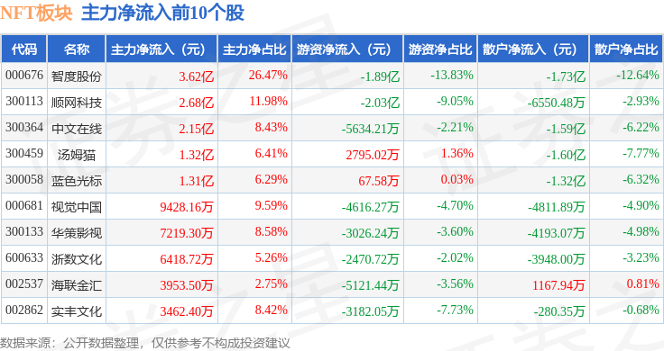 从资金流向上来看,当日NFT板块主力资金净流入2.57亿元,游资资金净流出5.23亿元,散户资金净流入2.66亿元。NFT板块个股资金流向见下表: