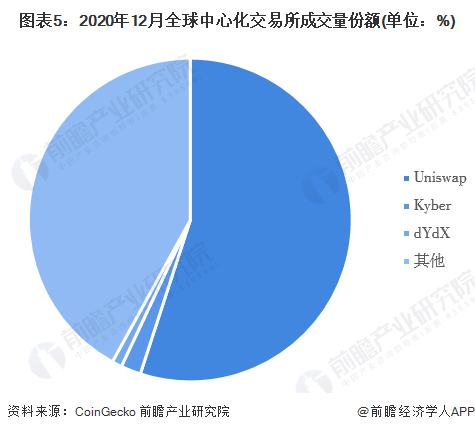 2020年,去中心化交易平台交易量从1月的1.63亿美元增长至12月的290亿美元,增长了180倍。Uniswap的成交量全年保持领先,至12月依旧保持55%的占比。Kyber和dYdX的占比分别减少了42%和15%。